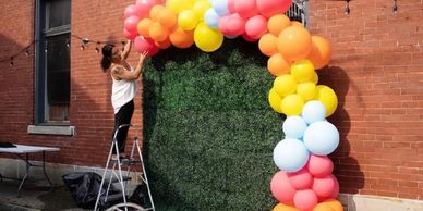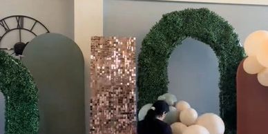 Our backdrops include flower walls, boxwood (greenery) walls, shimmer walls, layered drapery, wall to wall draping, wood walls, and flower arches. We also provide chiara arches, circle arches, organic arches, garlands, balloon walls, balloon columns, and foil/mylar balloons.